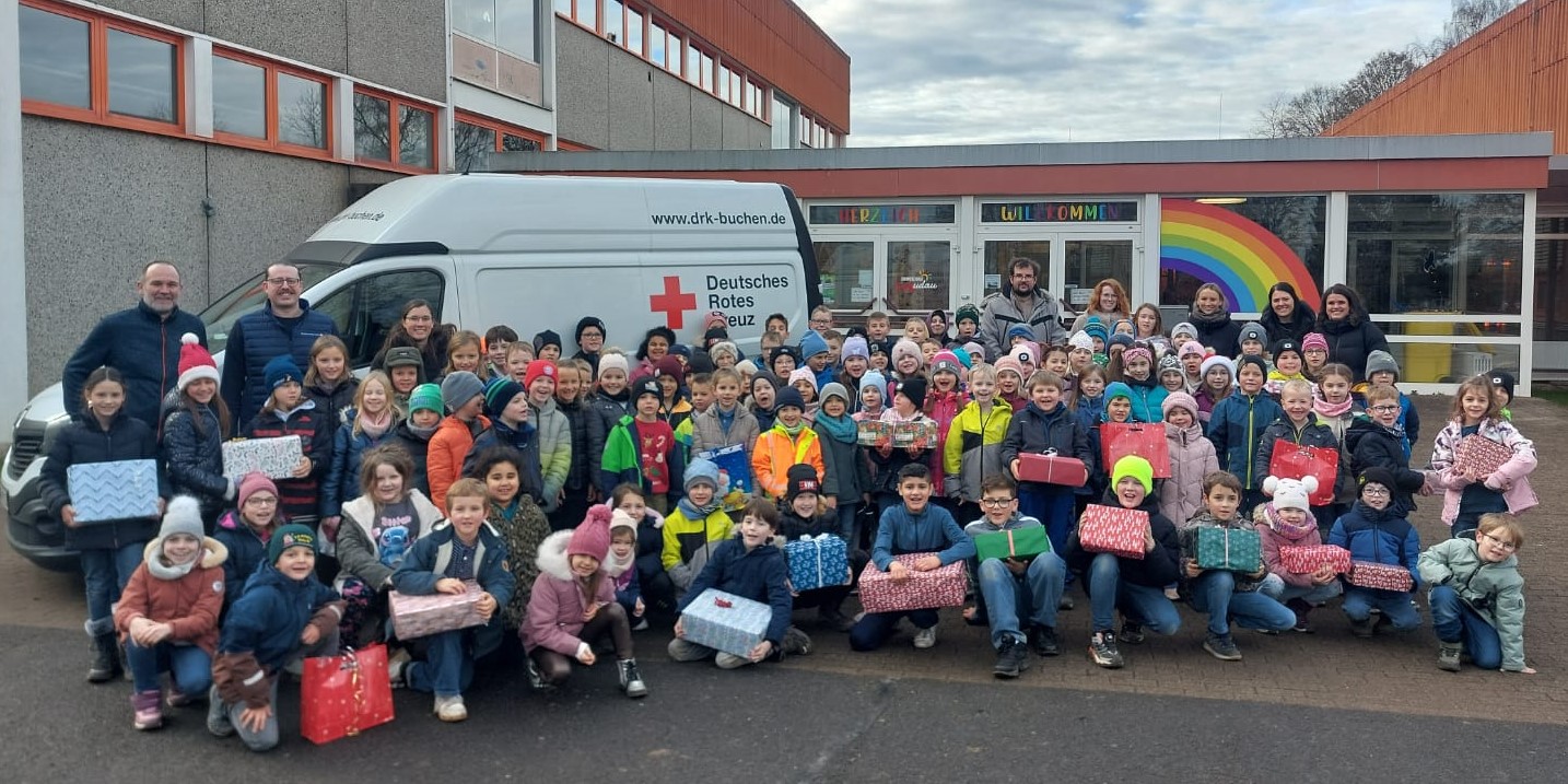 Am letzten Schultag vor den Weihnachtsferien konnte ein beeindruckendes Ergebnis verkündet werden: Insgesamt 110 liebevoll gepackte Pakete wurden an den Geschäftsführer des DRK-Kreisverbands Buchen e. V., Steffen Horvath, übergeben. Bei der Übergabe waren alle Kinder der Schule sowie das gesamte Lehrerkollegium anwesend. Alle zeigten sich sichtlich beeindruckt von der großen Anzahl der Spenden.